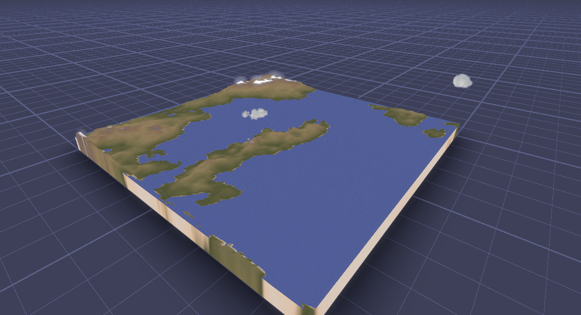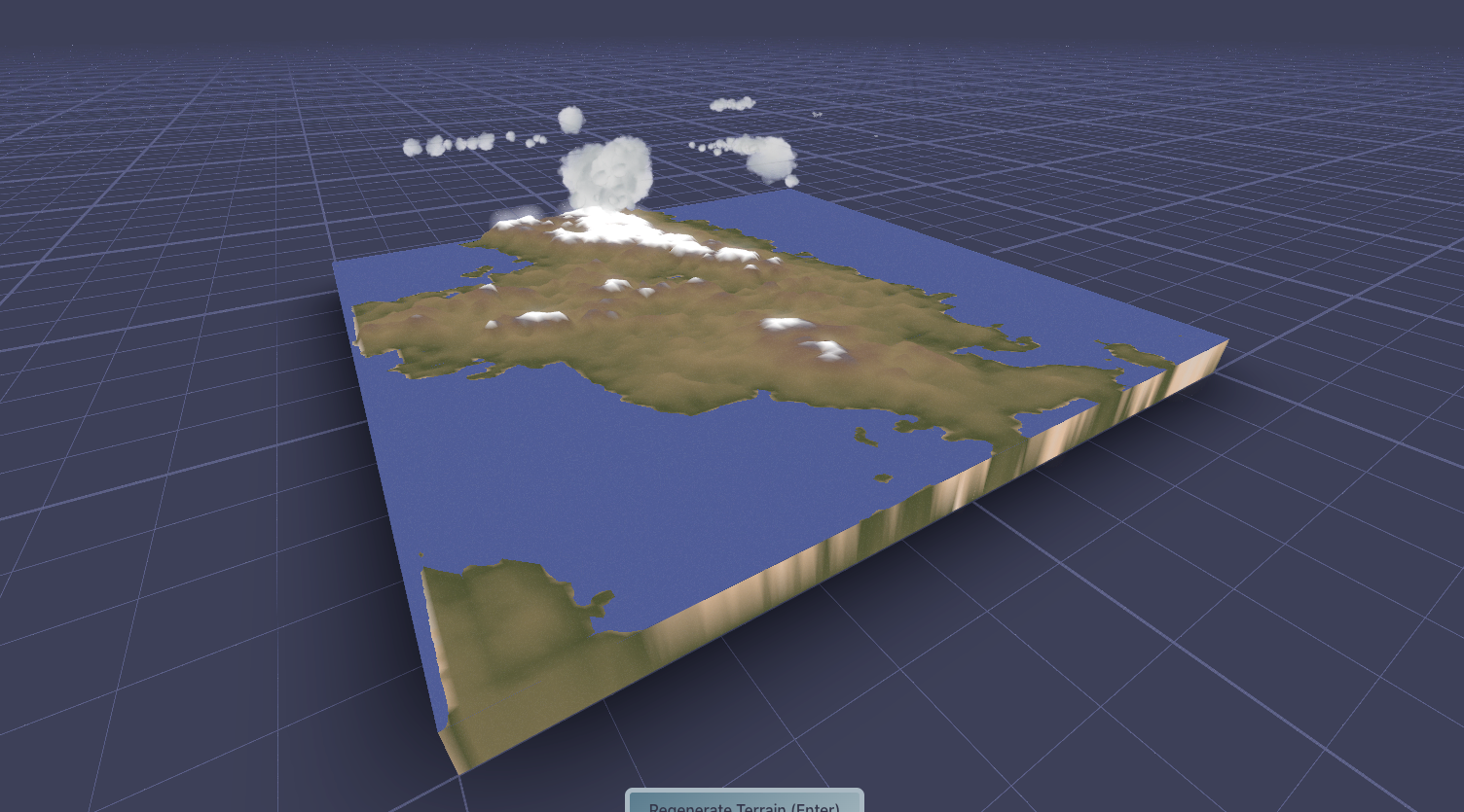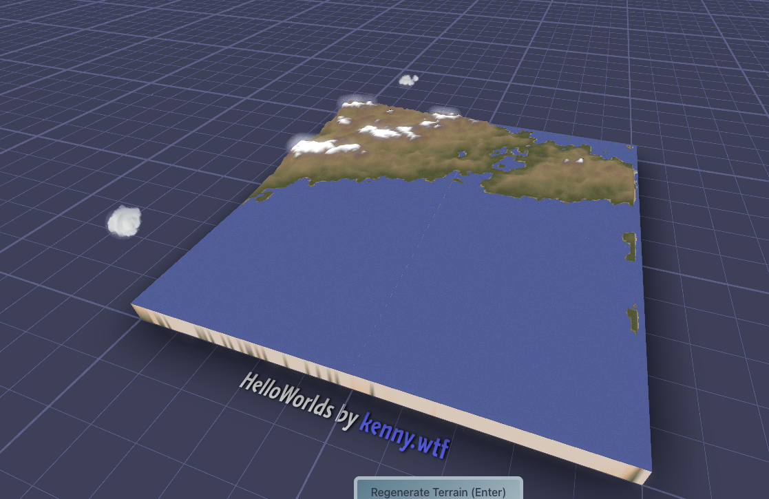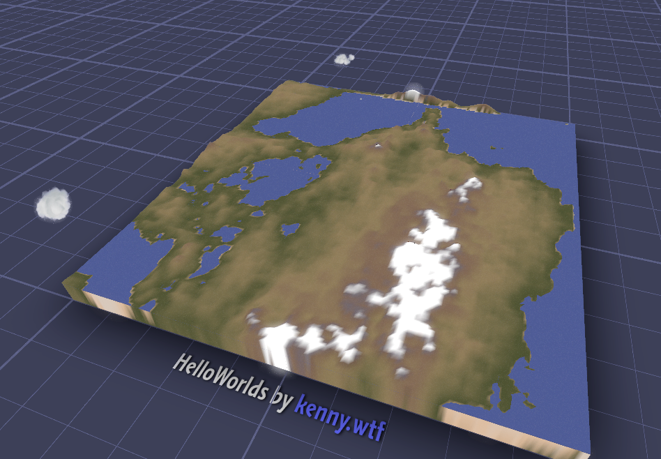 After sharing on twitter I got some great feedback (everyone likes the clouds… which is the part I didn’t write myself) about how sluggish things were when loading the model. I decided to shove all the model stuff in another thread, with ‘load’ and ‘generate’ methods exposed. The client can then load the big model and run it without lagging the UI (although, there’s some jank when the image data is passed from webworker to main thread then to the terrain quadtree generator)