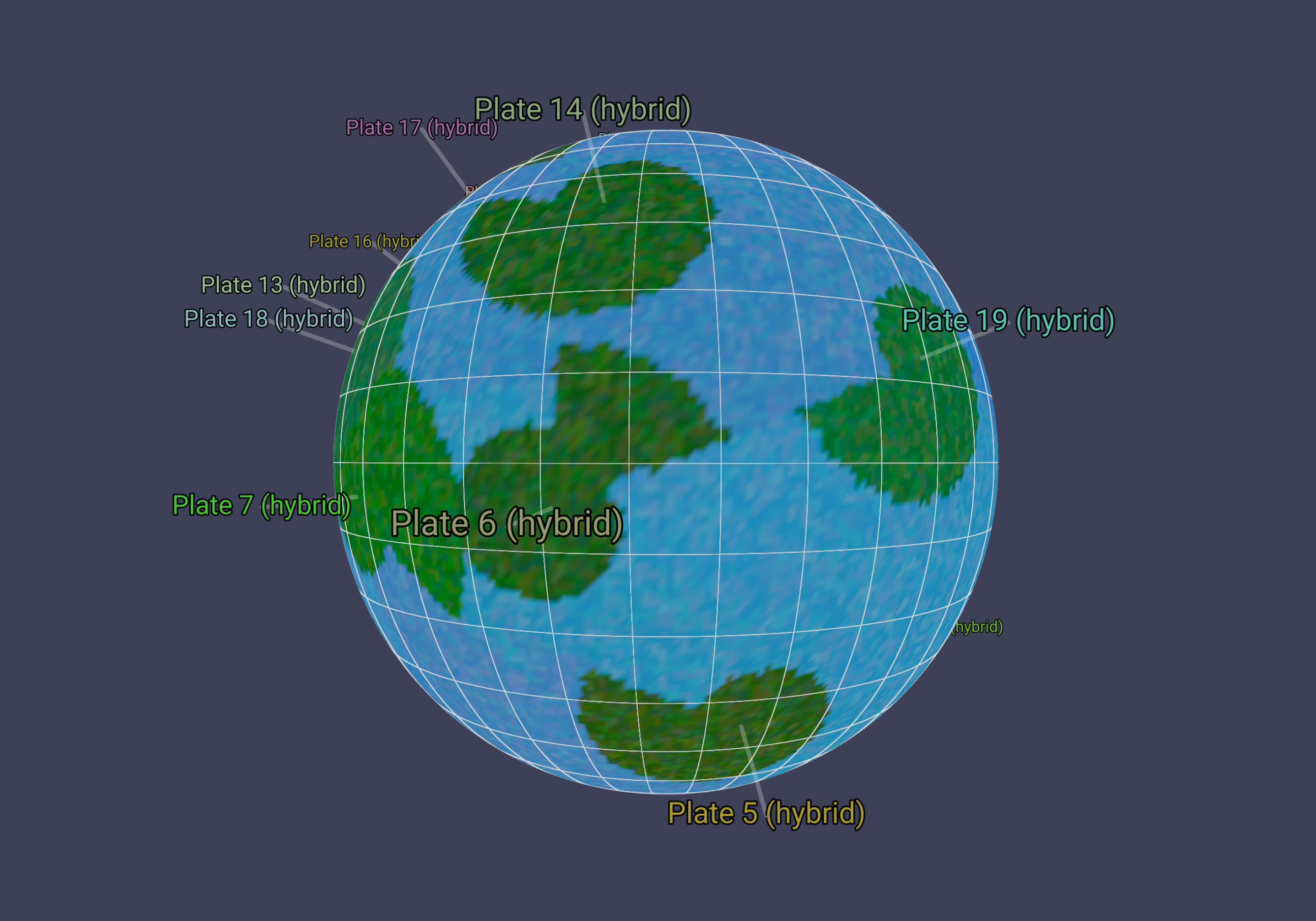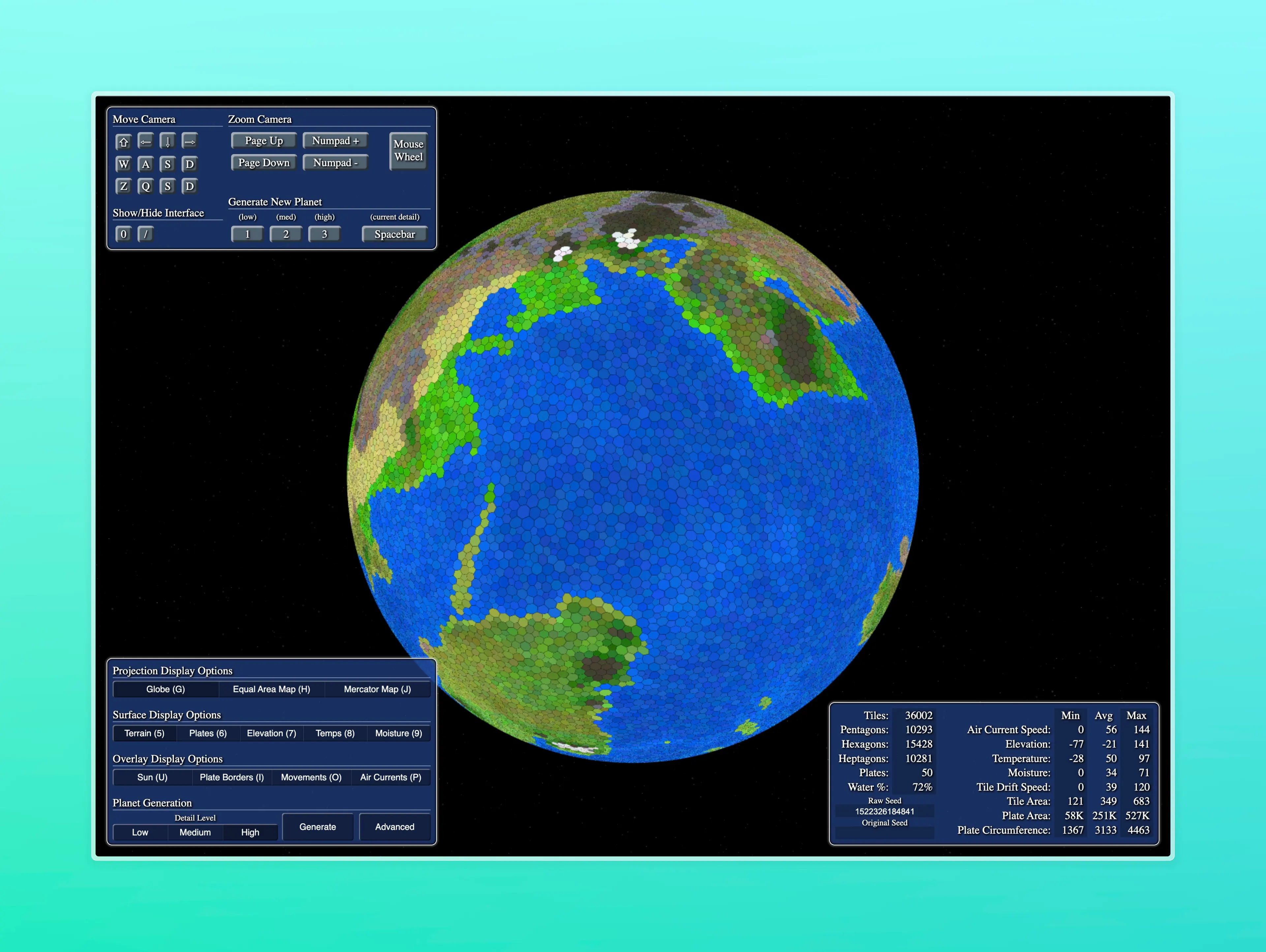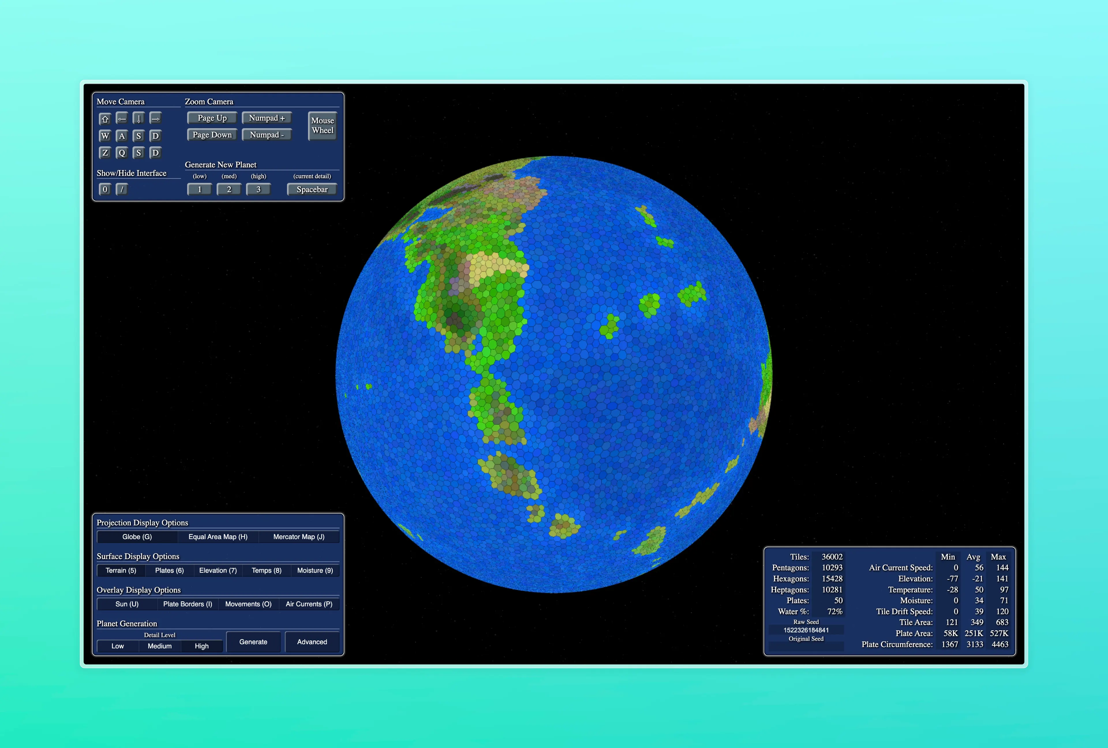 This project has been inspired by this beautiful tectonics-based world generator and it’s accompanying blog post, and I’ve been wanting to build it (and have a couple of discarded attempts) ever since I came across it while looking for a good world map generator for a dnd campaign I was running in 2018. It’s largely the reason I began learning webgl and built Hello Worlds . That blog post is a master class in procedural modeling, and includes techniques from tectonic stress simulation to climate modeling for biome placement. It effectively demystified procgen in general for me.