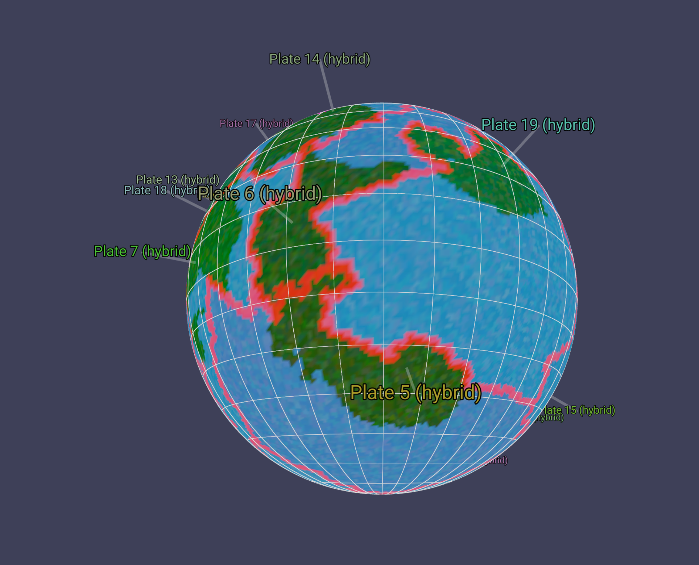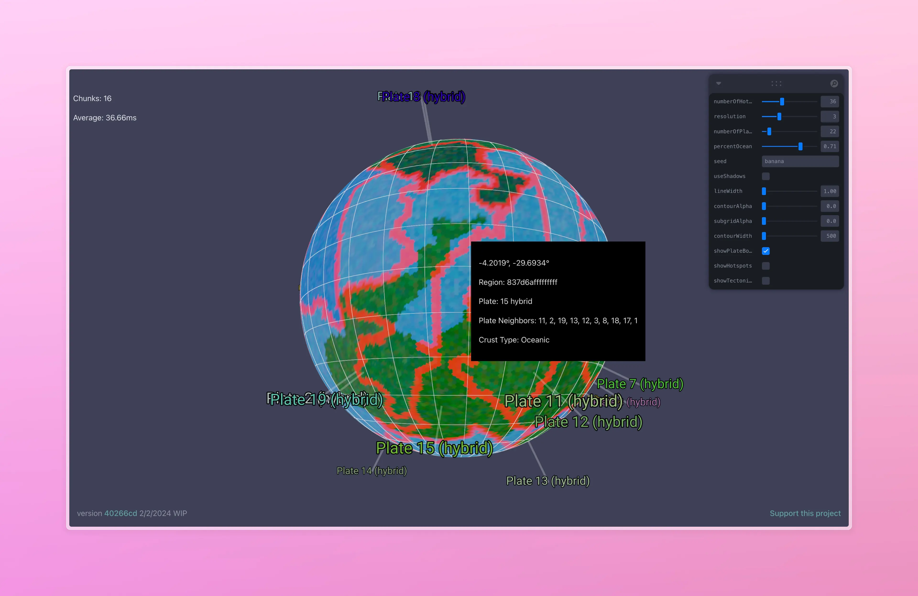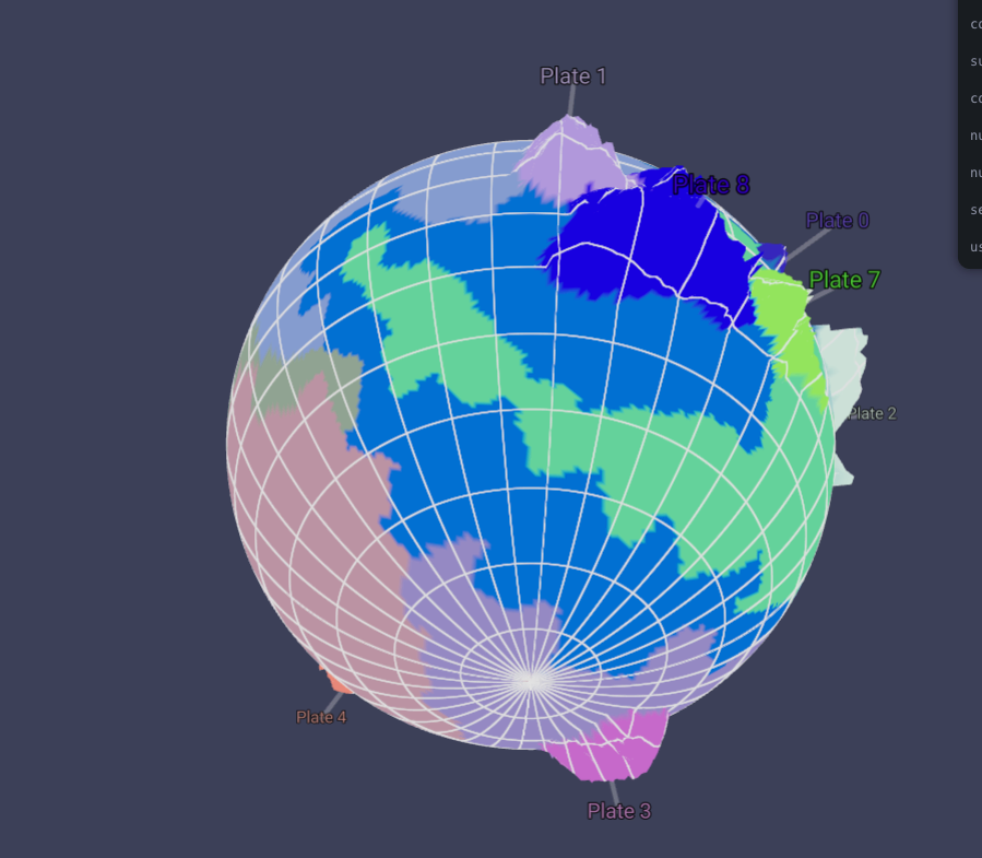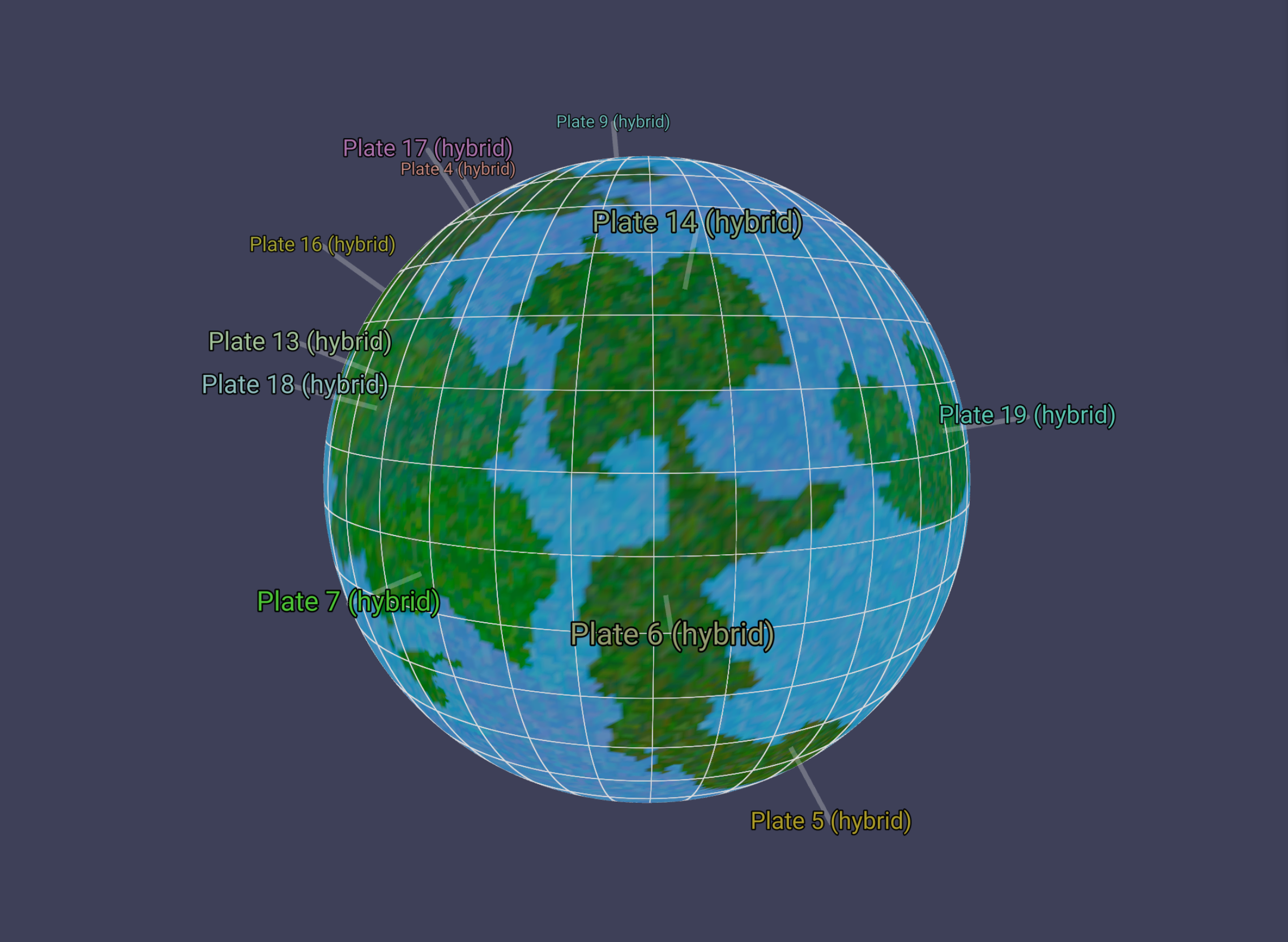This project has been inspired by this beautiful tectonics-based world generator and it’s accompanying blog post, and I’ve been wanting to build it (and have a couple of discarded attempts) ever since I came across it while looking for a good world map generator for a dnd campaign I was running in 2018. It’s largely the reason I began learning webgl and built Hello Worlds . That blog post is a master class in procedural modeling, and includes techniques from tectonic stress simulation to climate modeling for biome placement. It effectively demystified procgen in general for me.